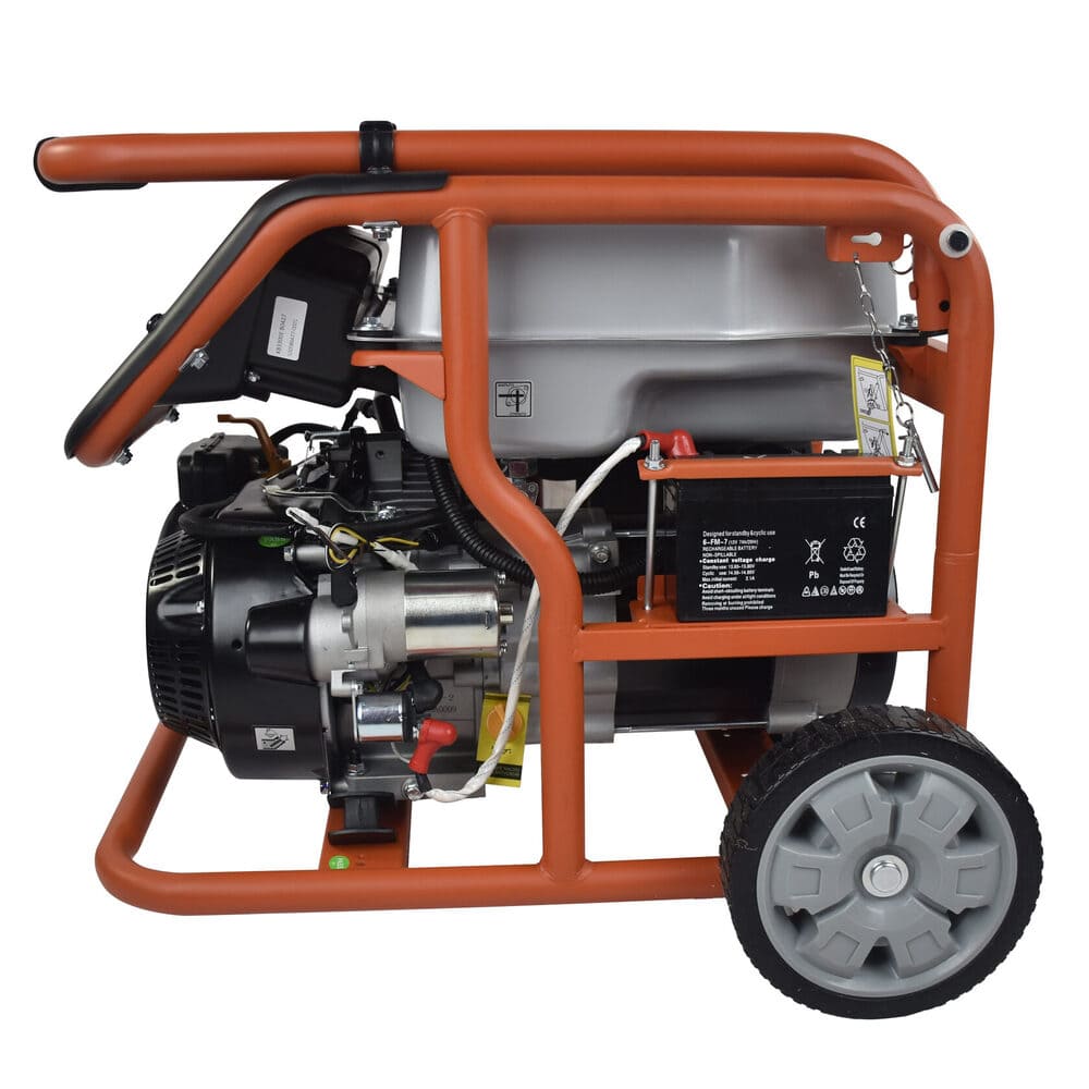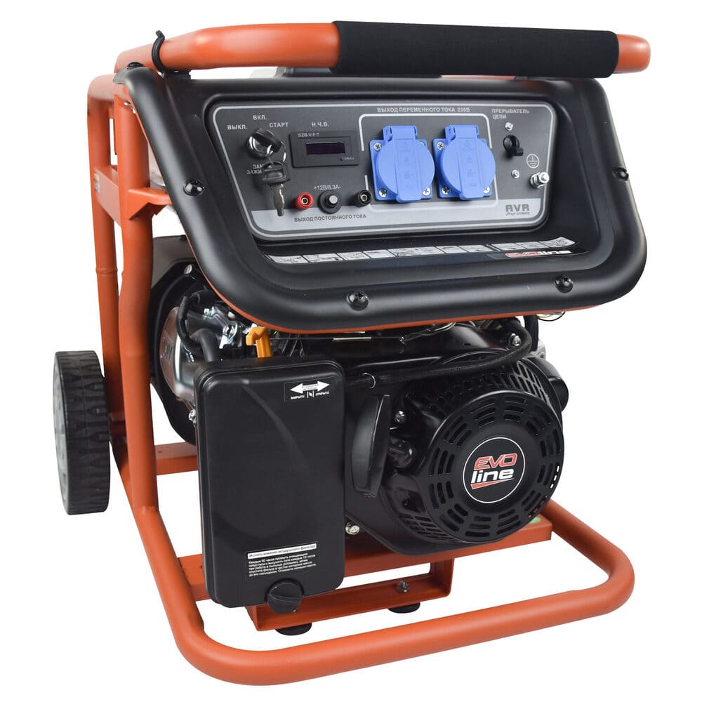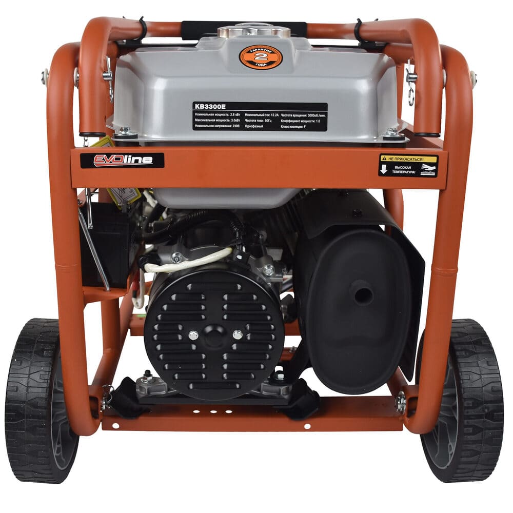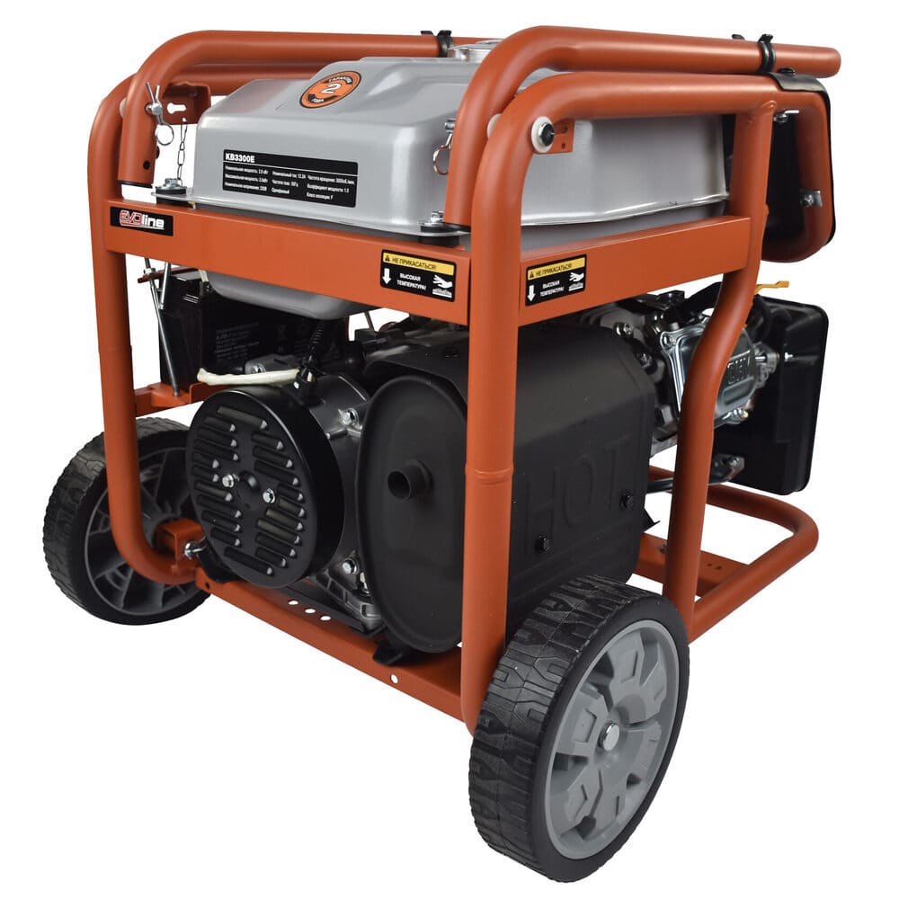 Электрогенератор EVOline KB 3300 E – бензиновый однофазный (1 фазный) генератор с максимальной мощностью 3 кВА. Силовым агрегатом данной модели является четырехтактный двигатель ZONGSHEN ZS170FE. Генератор оснащен электрическим запуском. Рама выполнена из высококачественной стали, которая служит не только для защиты двигателя, но и для удобной транспортировки электростанции. Объем топливного бака составляет 15 литров, что дает примерно 10 часов непрерывной работы в зависимости от нагрузки. Уровень шума при работе генератора составляет 76,5 дБ. Данная модель идеально подходит как для дома, так и для малого или среднего бизнеса. Оснащена транспортировочным комплектом с колесами, счетчиком мото-часов, электростартером и 2-мя розетками, имеет размер (590 x 440 x 500 мм) и вес (52 кг). Гарантия составляет 2 года.