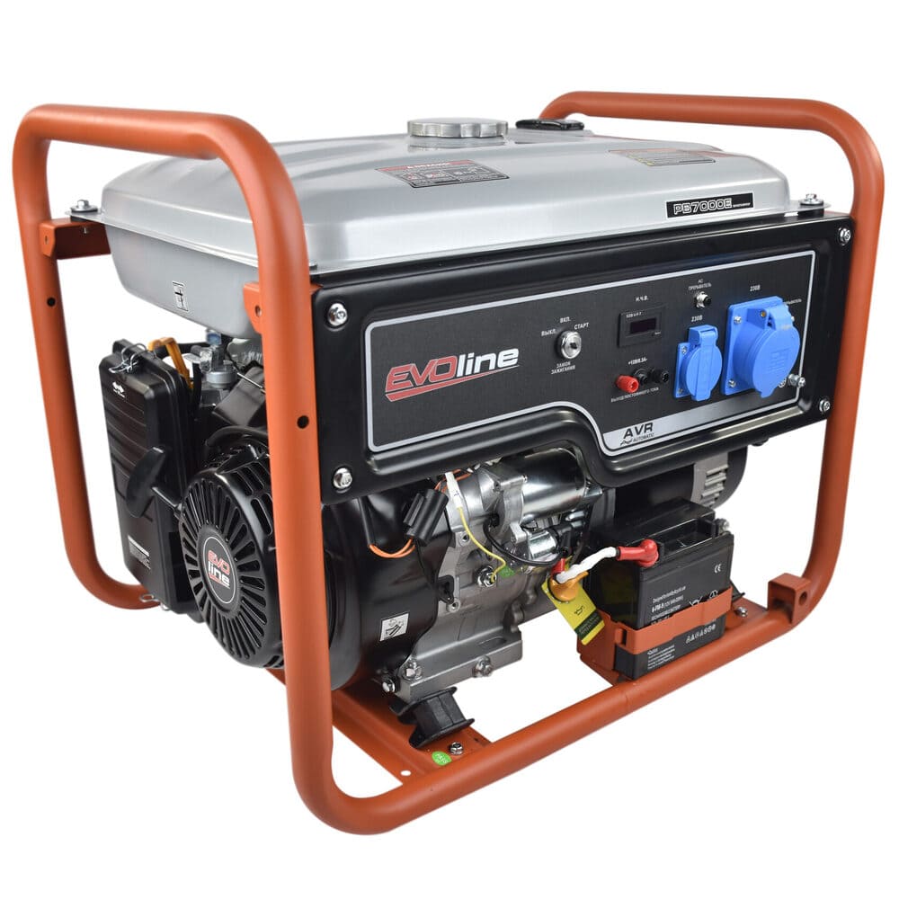 Генератор EVOline PB 7000 E с бензиновым двигателем GB 420. На корпусе установлены одна розетка 16А и одна силовая розетка 32А. Генератор EVOline PB 7000 E является однофазным. Большой топливный бак обеспечивает долгую непрерывную работу. Рама защищает генератор от внешних воздействий. Генератор бензиновый EVOline PB 7000 E подойдет для загородного дома и малого бизнеса.